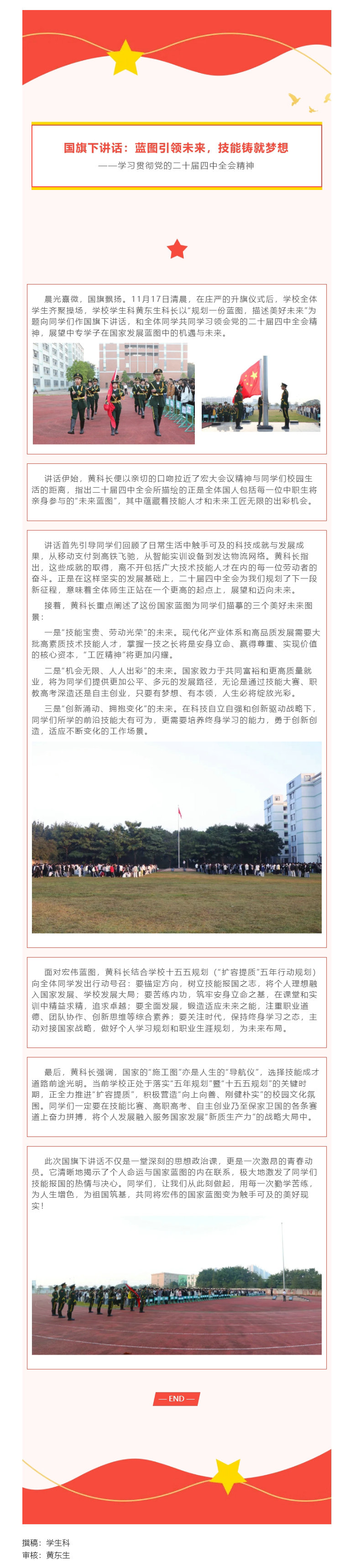 当前位置:主页->信息中心->学生科->校园新闻->国旗下讲话:蓝图引领未来,技能铸就梦想——学习贯彻党的二十届四中全会精神