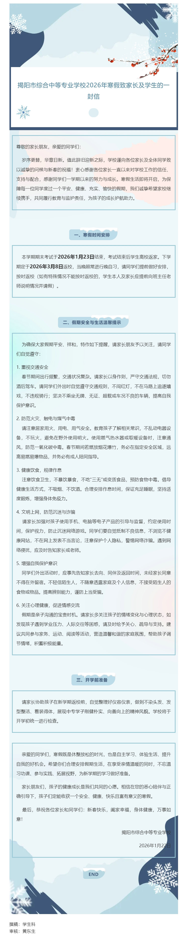 揭阳市综合中等专业学校2026年寒假致家长及学生的一封信