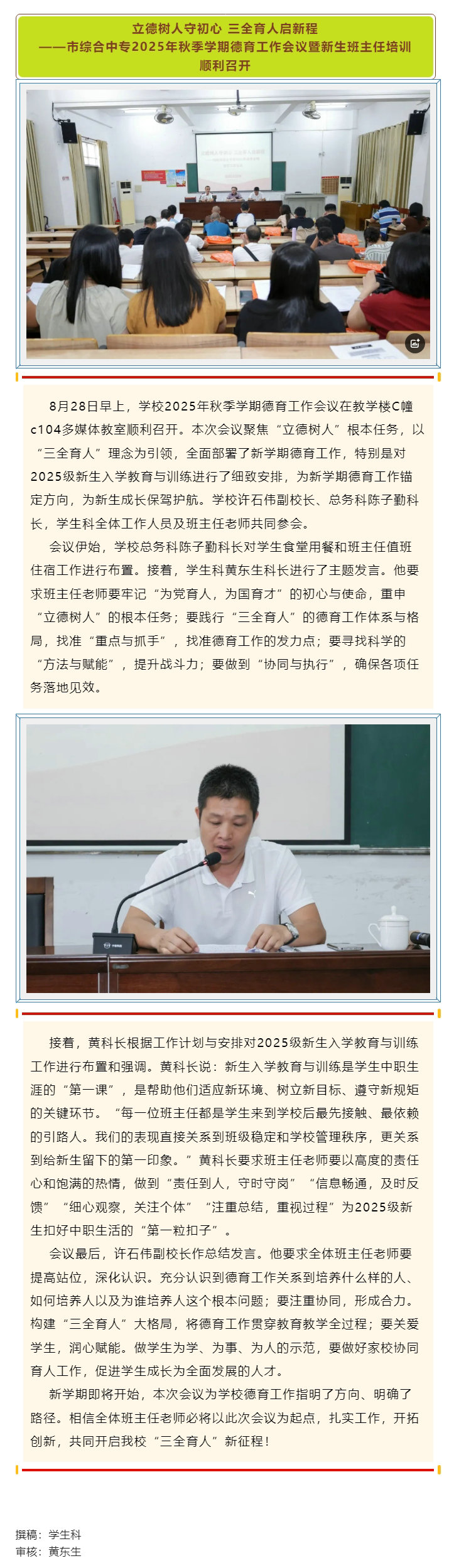 立德树人守初心 三全育人启新程——市综合中专2025年秋季学期德育工作会议暨新生班主任培训顺利召开