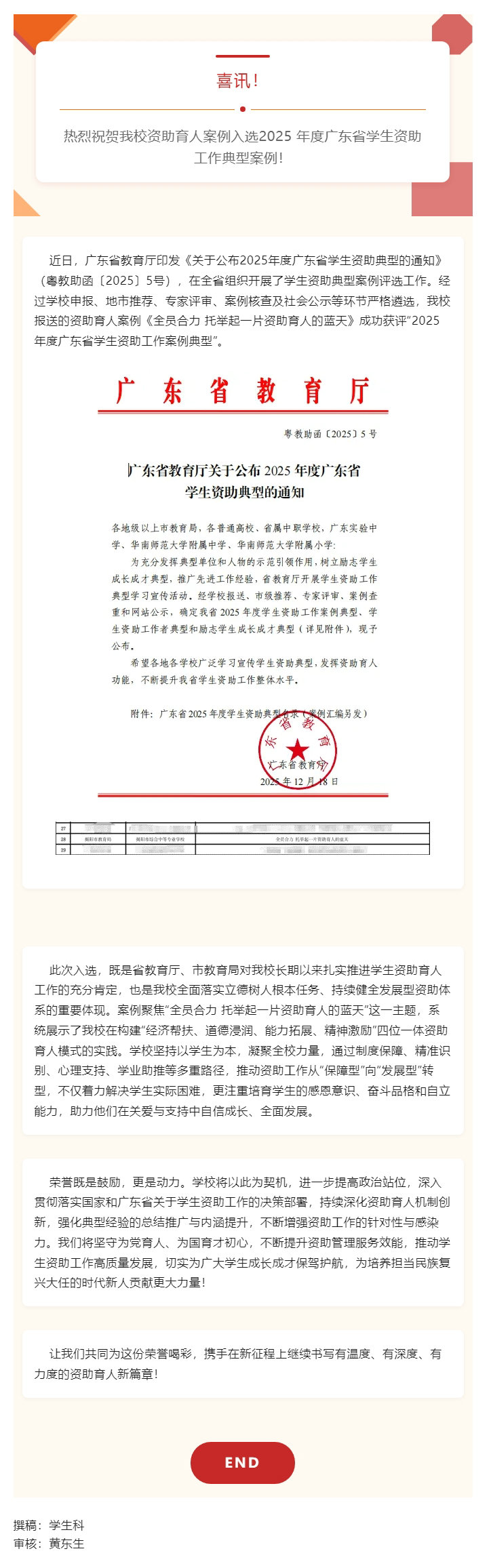 喜讯!热烈祝贺我校资助育人案例入选2025年度广东省学生资助工作典型案例!